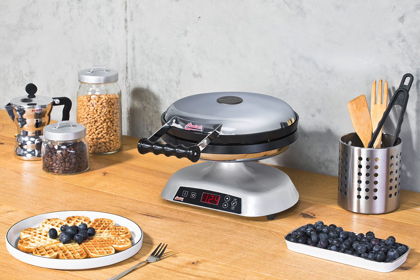 • Baking plates (Technology): CAD-optimised design. Aluminium casting through gravity die casting process. CNC-controlled finishing of the raw casting. Modern PTFE coating for easy removal of the waffles without sticking.