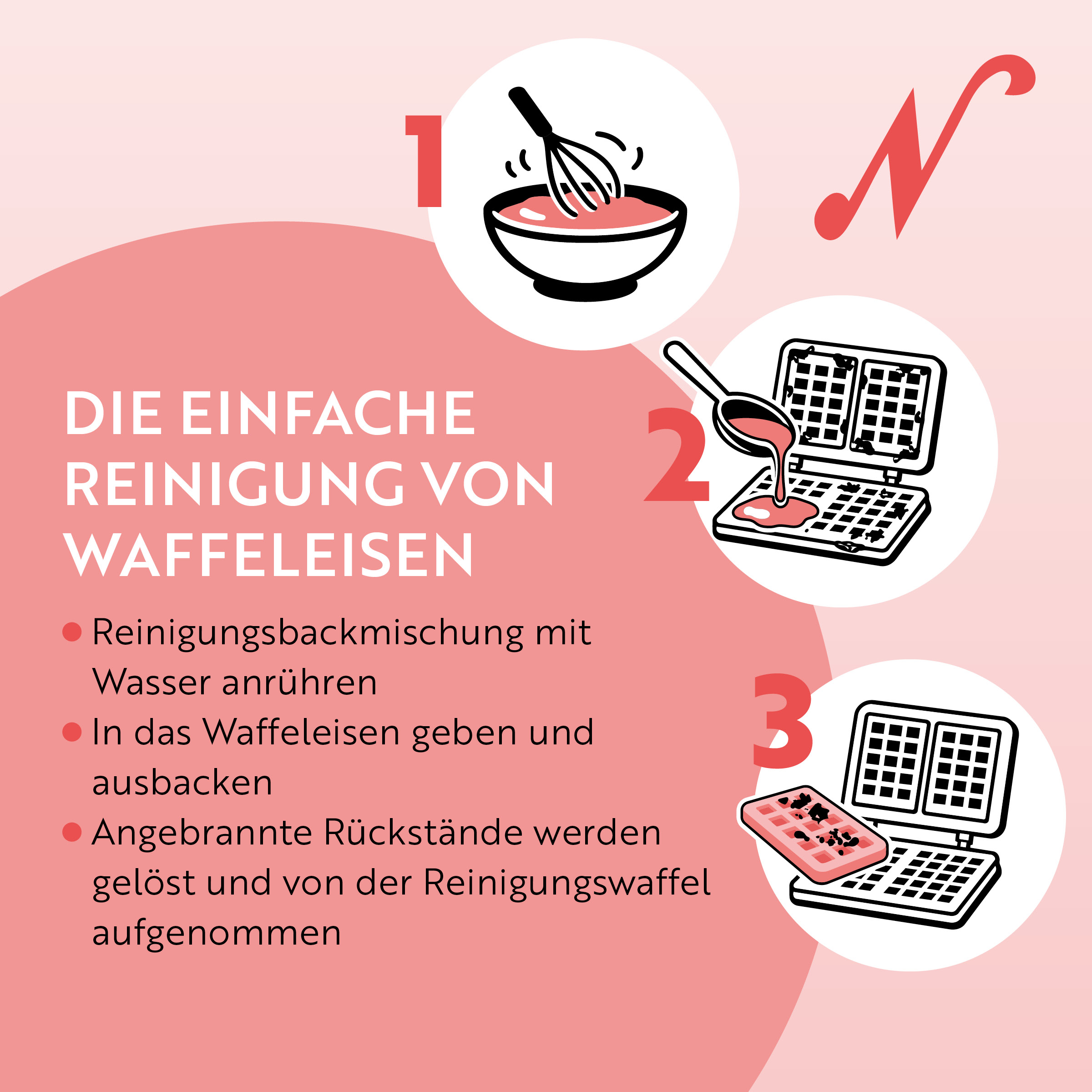 The easy-to-use cleaning baking mix for waffle makers. Just mix it with water and bake it in the waffle iron. While it‘s baking, it will loosen any residues, which will then be absorbed by the cleaning waffle and removed from the waffle maker along with the waffle.