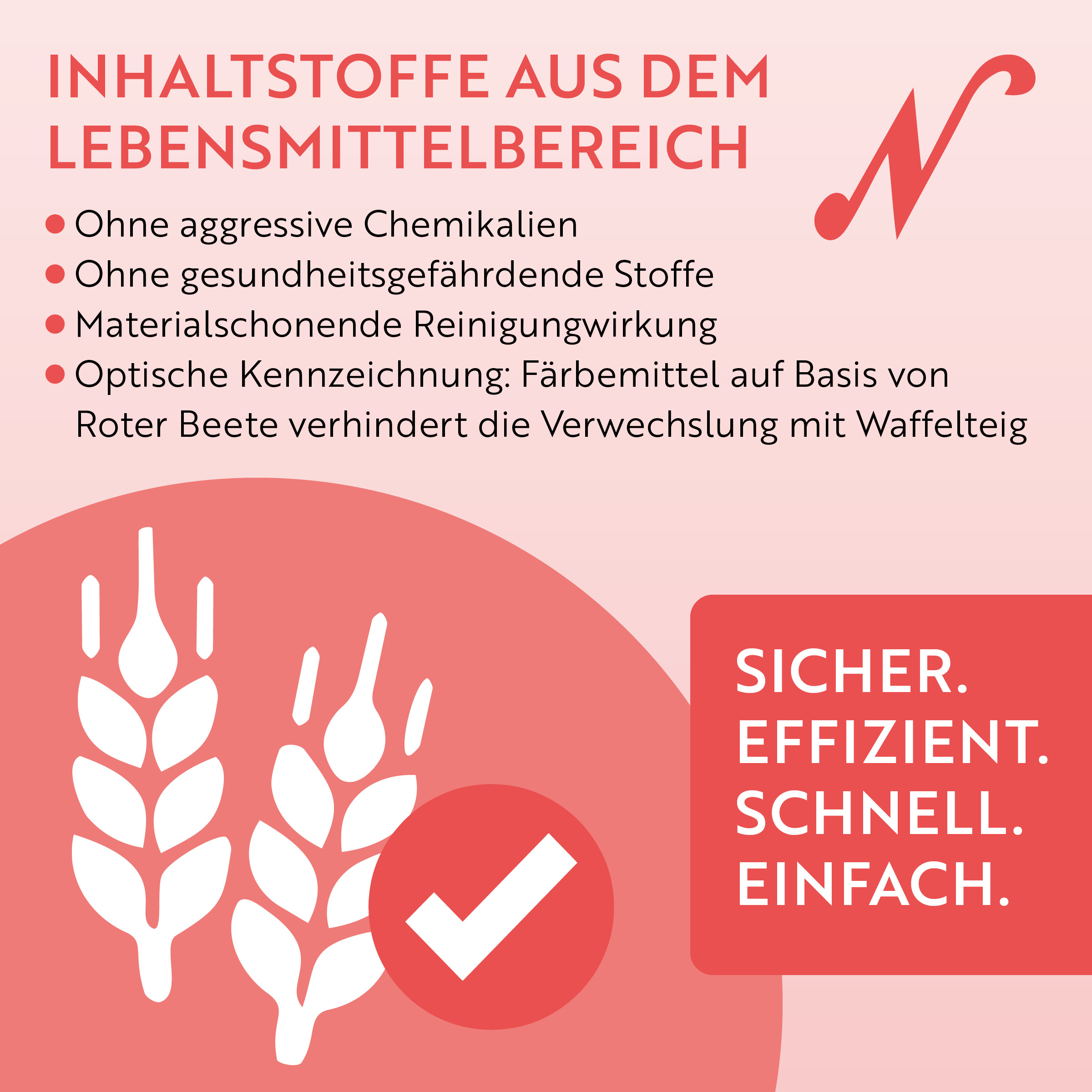 - During the baking process, the food-grade formula effectively dissolves burnt-on residues. These are absorbed by the cleaning waffle and removed cleanly from the mould.
