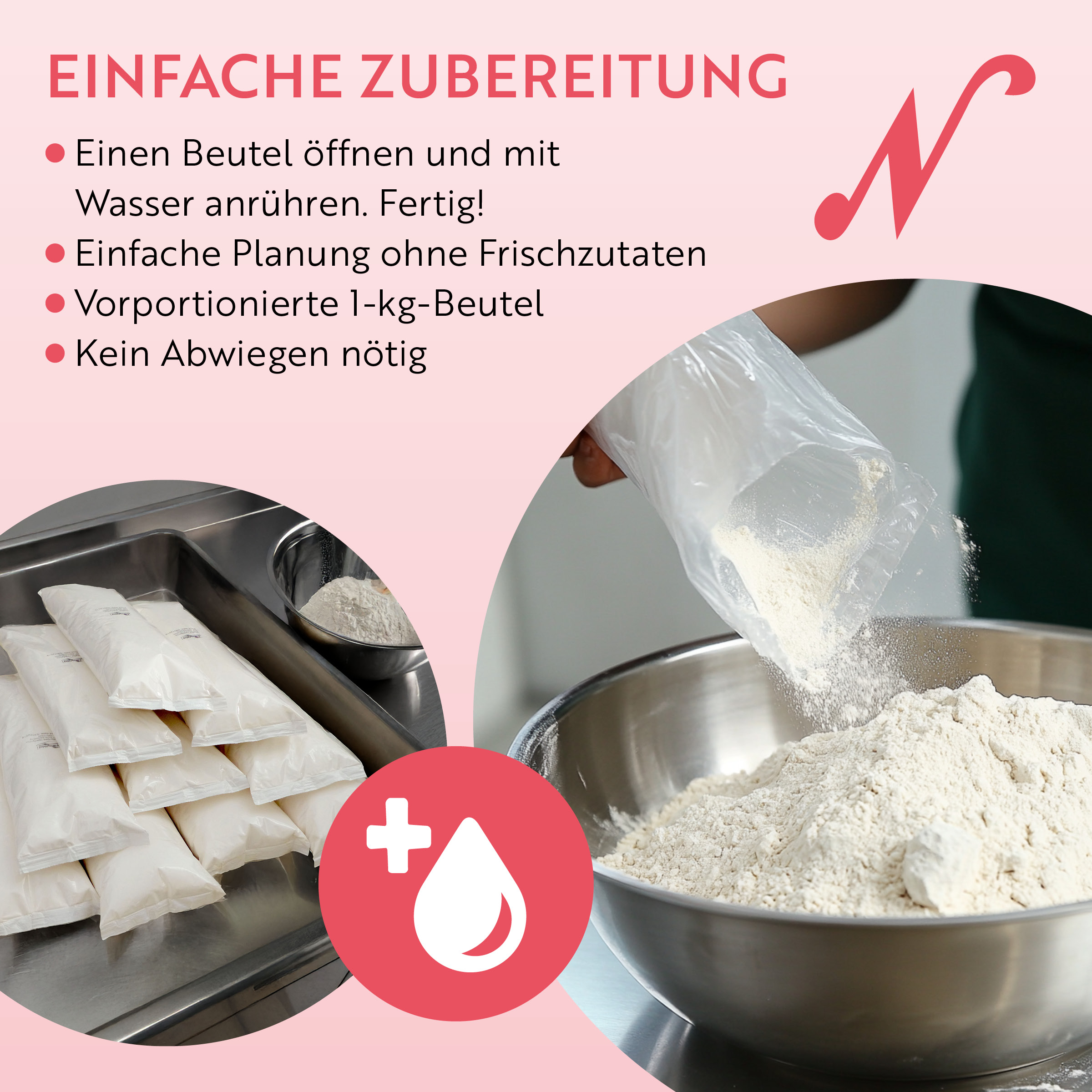 Quick and flexible to use: the baking mix is simply mixed with water and can be prepared as a protein waffle in a waffle maker or as pancakes in a frying pan. No fresh ingredients are required, and it is ready to use immediately. Thanks to its space-saving storage and no refrigeration requirements, the mix is ideal for a smooth workflow in daily catering operations.