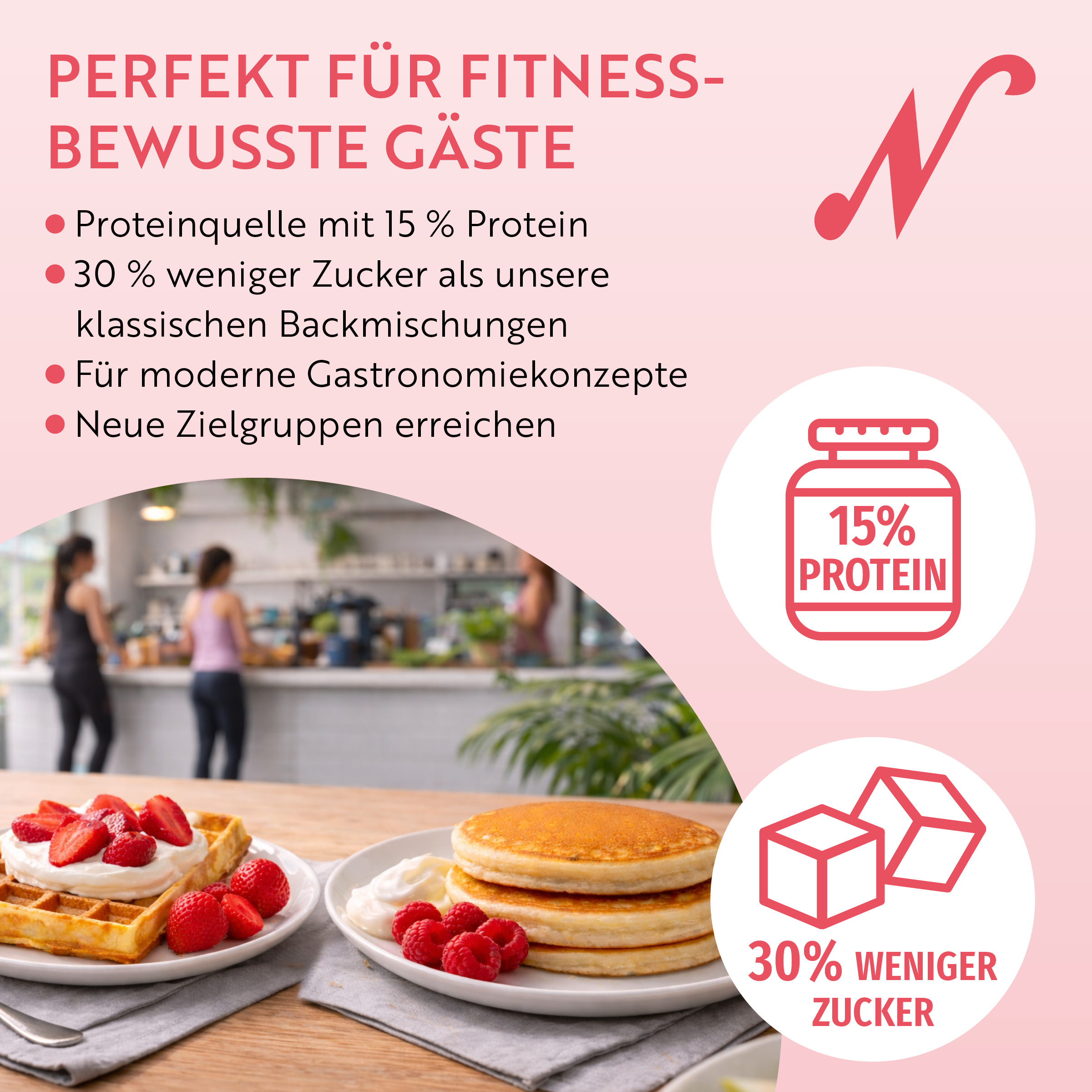 The perfect mix for modern catering concepts: high in protein, reduced in sugar and quick to prepare. As a source of protein with 15% protein and 30% less sugar than our classic baking mixes, it appeals to health- and fitness-conscious guests. Just add water: ready for waffles or pancakes that taste great and fit perfectly into an active lifestyle.