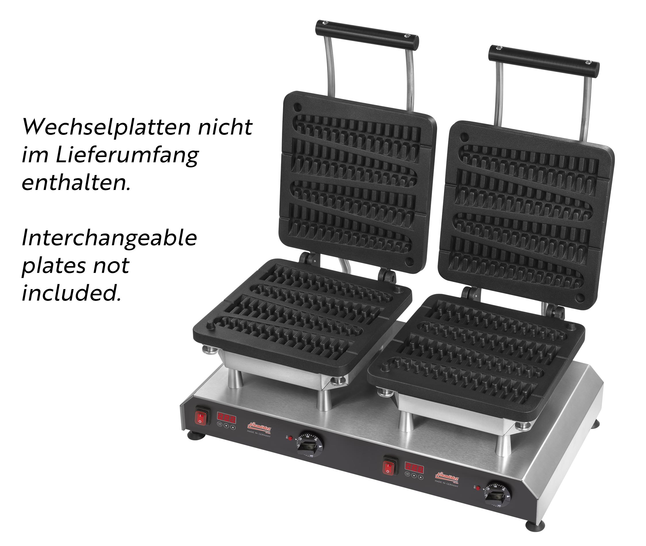 • Currently more than 25 different interchangeable plates available, e.g. for waffles, paninis, pancakes, donuts, sandwiches, churros