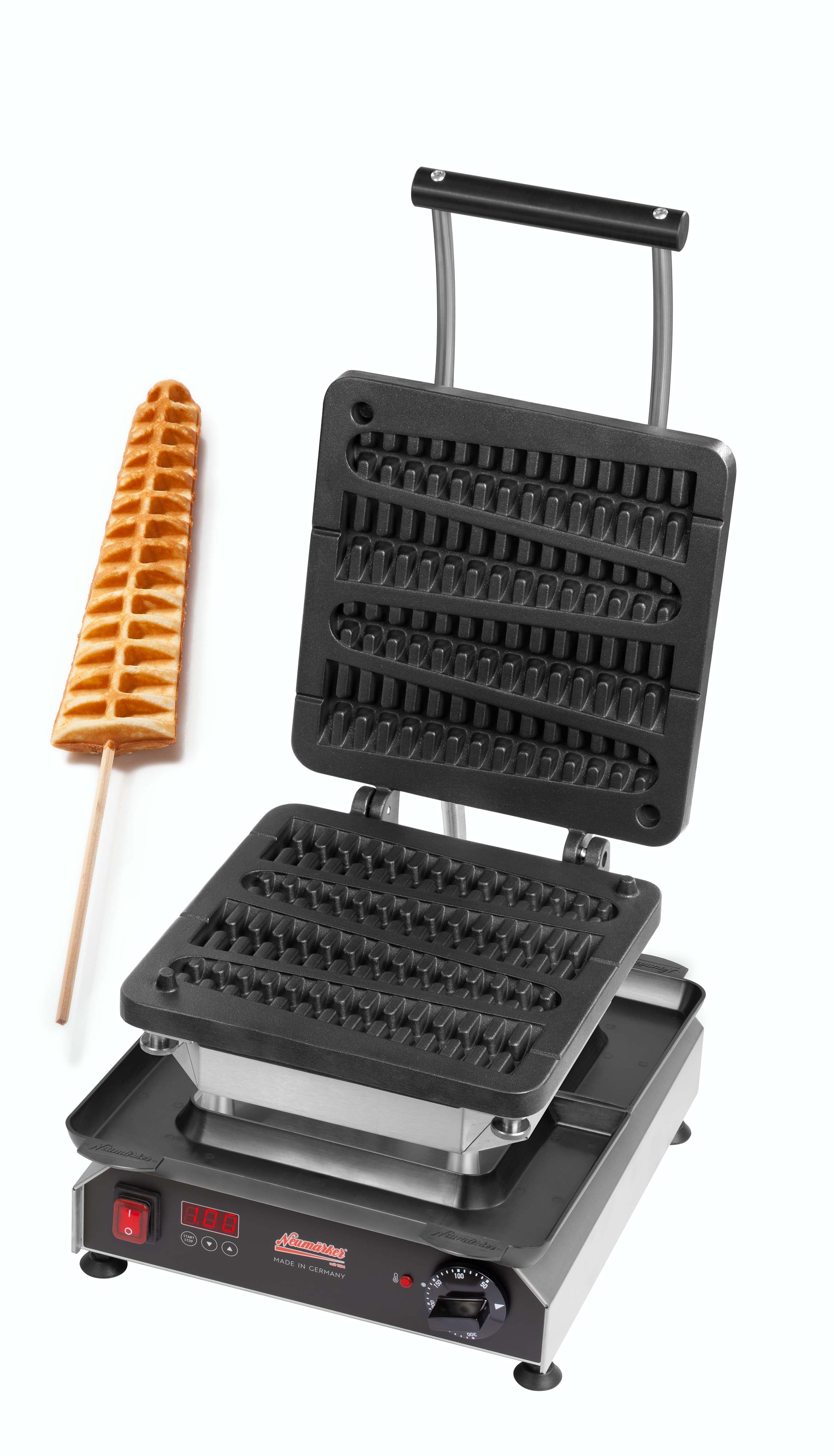 The Event Waffle. Extremely short baking time of approx. 1 minute for 4 waffles, little cost of goods and striking design. Offers creative marketing possibilities like a christmas tree or a sword waffle.
