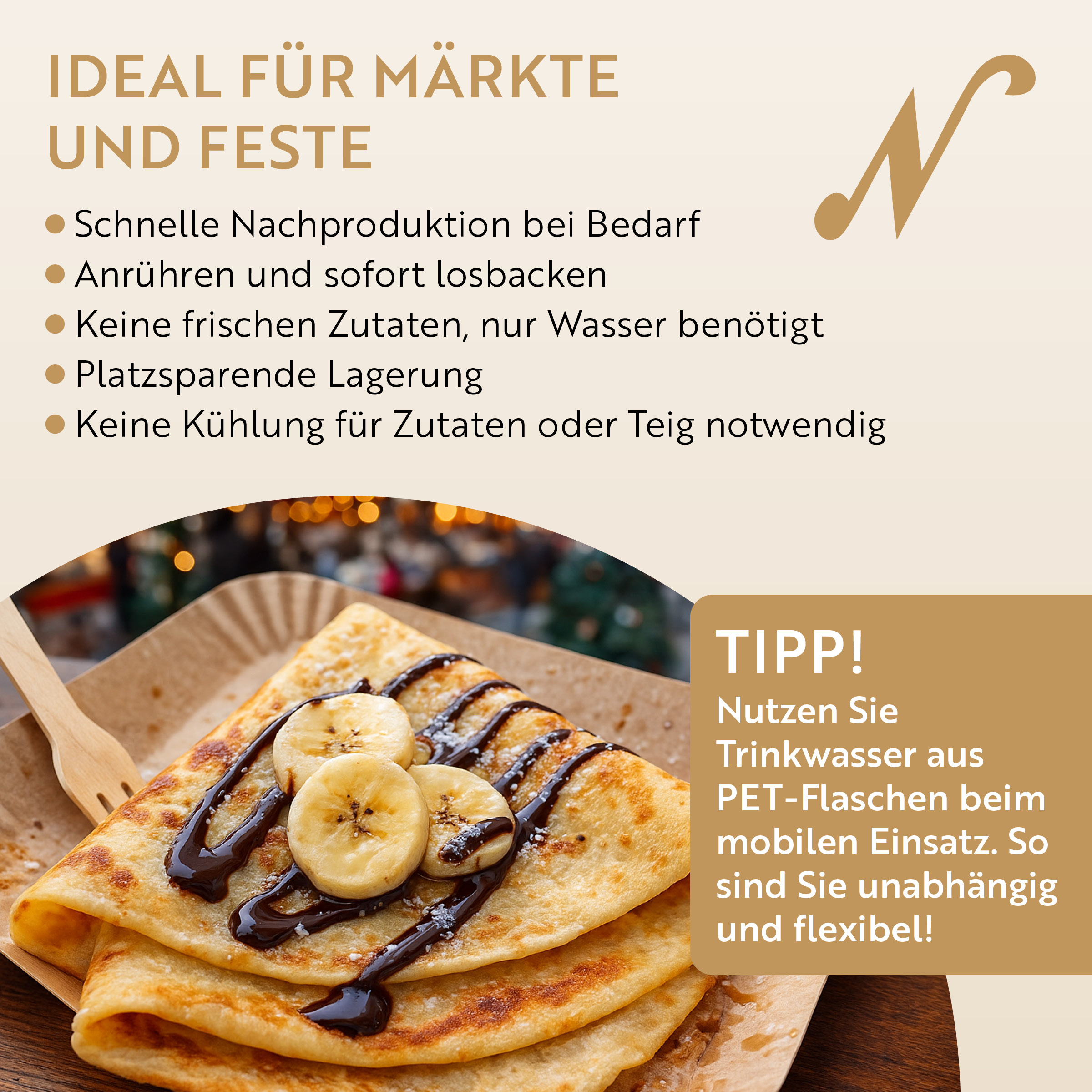Mit reduziertem Salzgehalt für ein feineres Aroma und einer vereinfachten Zubereitung, die nur noch Wasser benötigt.Die ideale Crêpes-Backmischung für Märkte und Feste: