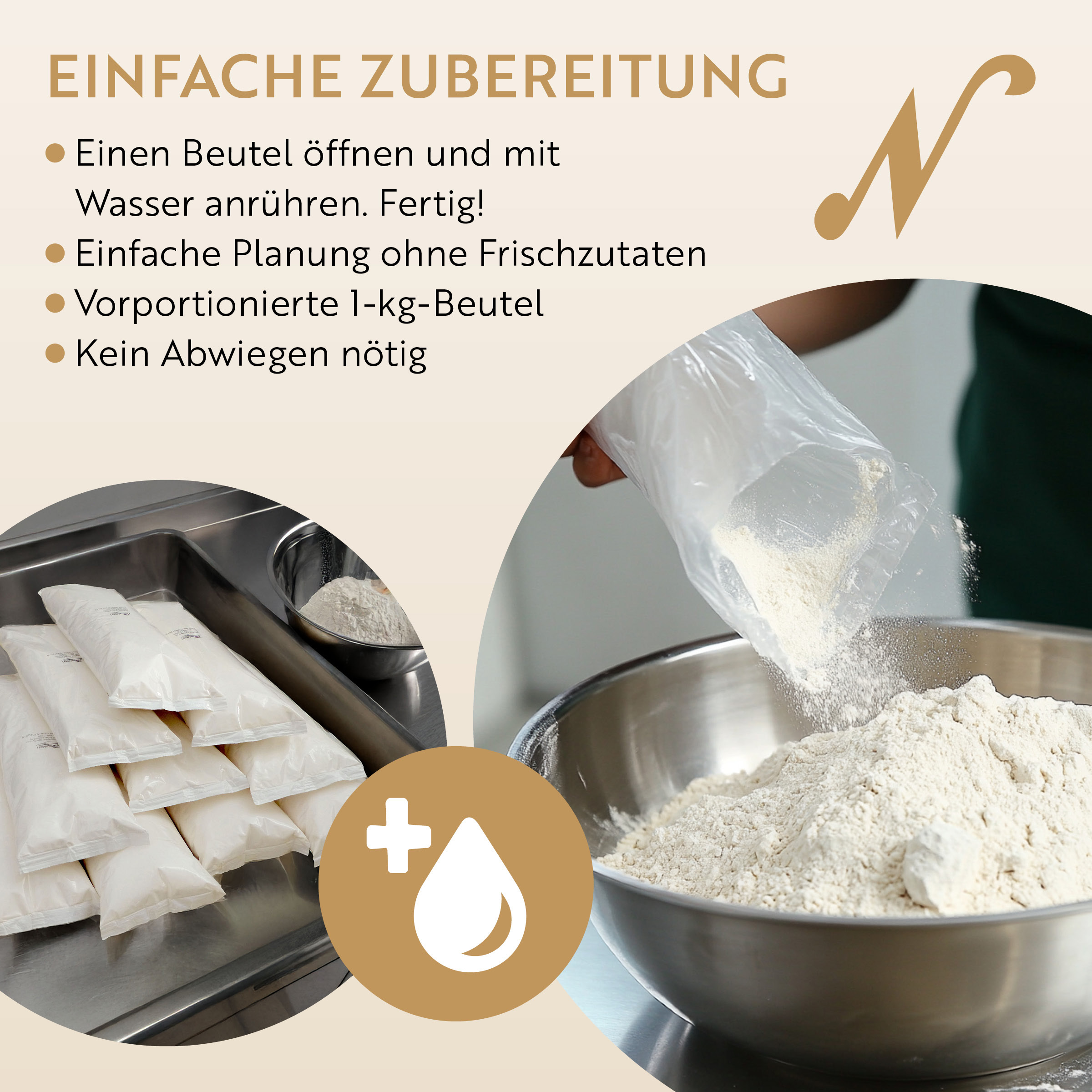 - Ein Karton beinhaltet 10 Beutel mit je 1 kg Mix. Das ist besonders praktisch, da bei der Zubereitung kein Abwiegen der Zutaten nötig ist. Einfach einen Beutel Mix mit 500 ml Wasser verrühren.