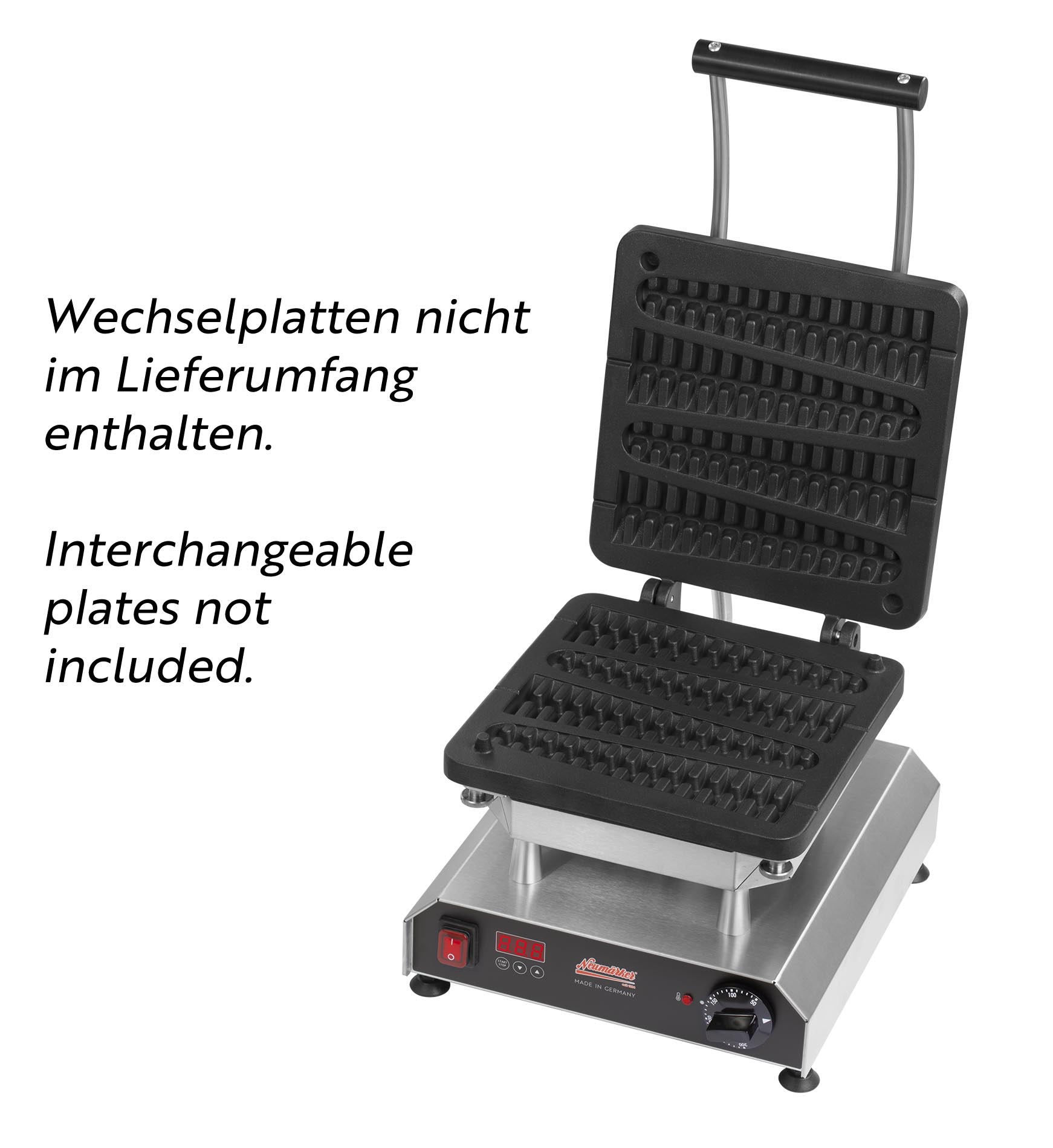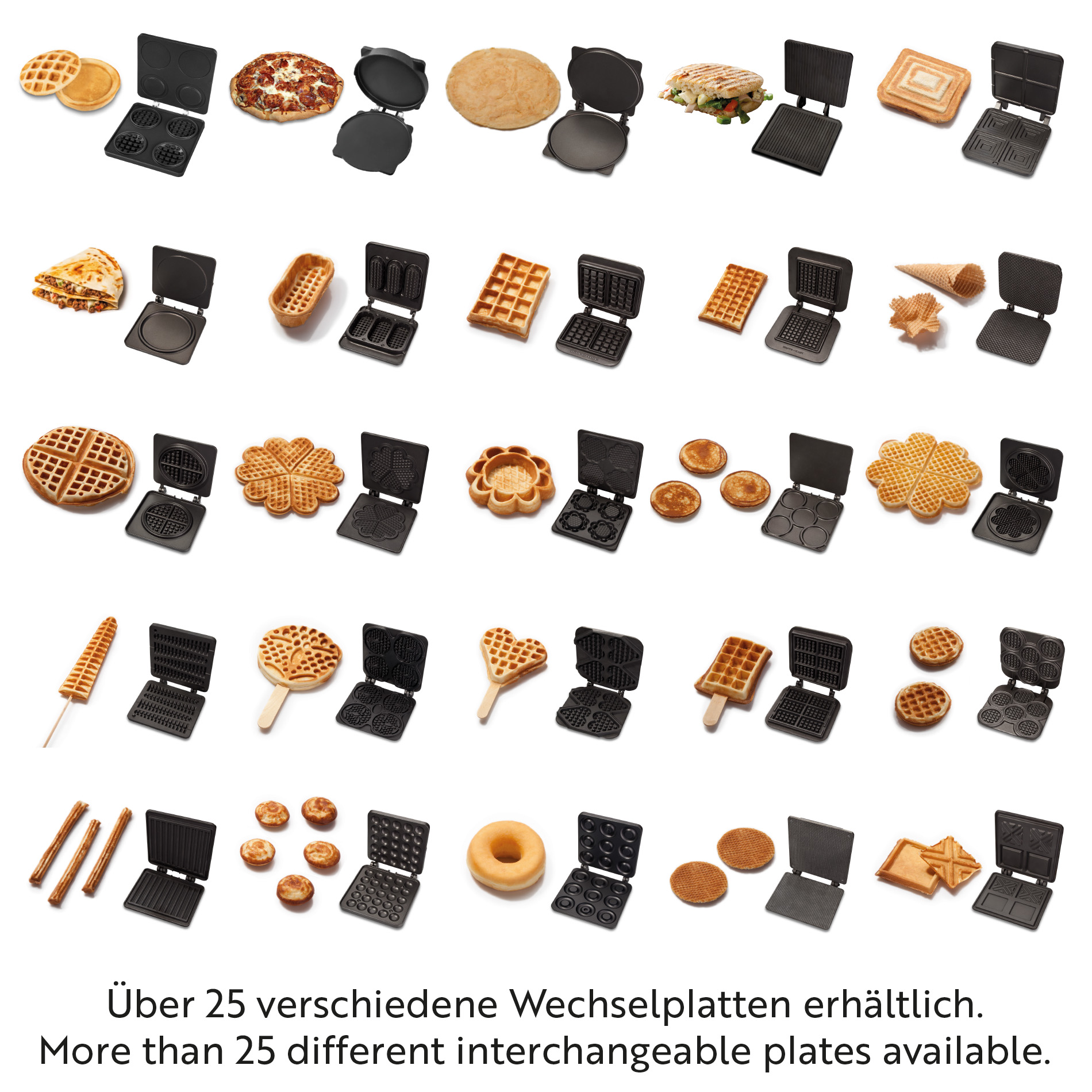 - Aktuell über 25 verschiedene Wechselplatten erhältlich, z.B. für Waffeln, Pizza, Crêpes, Paninis, Pancakes, Donuts, Sandwiches, Churros u.v.m
